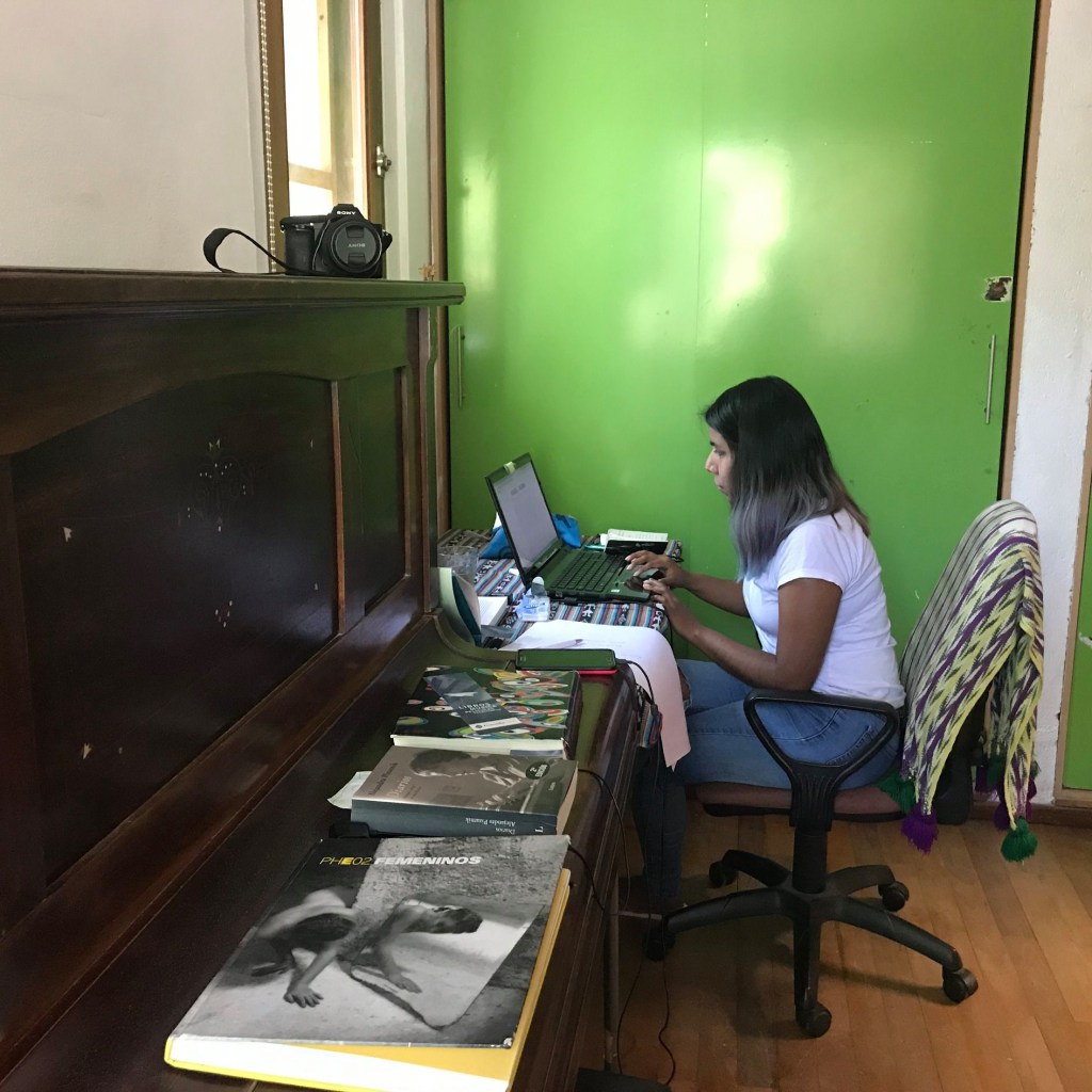 Soy Mónica, fotógrafa, becada del FNA. Estuve realizando una residencia en casa estudio B’atz’ durante la segunda quincena de febrero y los primeros días de marzo. Como espacio es lo ideal. Me apropié de cada rincón, cada crujido de las maderas y de cada roce de las ramas. El verde infinito de las ventanas, los ocres lavados de las paredes. Quise sumergirme en cada libro que pude. Tuve una guía que me sostenía el libro indicado y me miraba como nadaba en él. Los días ya no tenían horas. El caer del sol determinaba una pausa, un descanso, una ducha, una comida. Las horas pasaban y fueron las más provechosas de mi vida. Lo introspectivo que rebalsa, te avasalla y te hace dar cuenta que el piso se mueve, se sacude pero que está bien, es parte del camino. Me sentí en paz, tranquila como hace mucho tiempo no estaba. Me sentí acompañada en mi soledad.